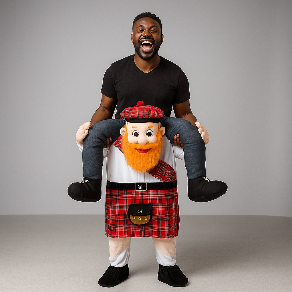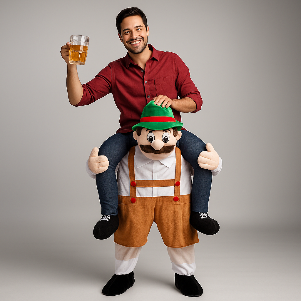 Bringe Lachen zu deiner Oktoberfest-Feier mit diesem lustigen Piggyback-Kostüm. Entworfen, um wie ein Biermann aus Bayern auszusehen, der dich trägt – die perfekte Mischung aus Humor und Festlichkeit.